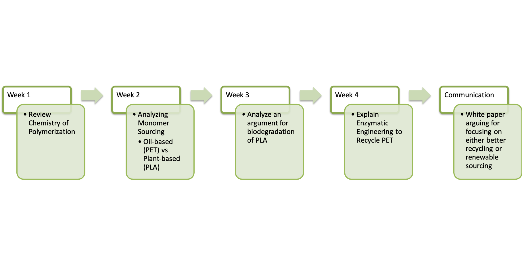 Case Study 2 (CS2) focused on a life-cycle analysis of polymers used in single-use plastic drink containers, the timeline of which can be found in figure 1. In week one (CS2W1) students were reintroduced to the chemistry of polymerization, a topic that they would have covered in the prerequisite course Organic Chemistry I (CEM251). In one prompt students were asked to predict the mechanism of polymerization. In the following prompt (figure 2) students were asked to explain what was happening and why it happens. Student responses were coded using a codebook for mechanistic reasoning (figure 3) adapted from3.