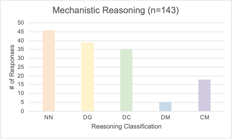 Coding of student responses (figure 4) revealed that most groups tended towards non-normative (NN), descriptive general (DG), and descriptive causal (DC) explanations. Interestingly there were very few descriptive mechanistic (DM) explanations. The prevalence of overly simplistic explanations and lack of DM explanations suggests that there is a problem with our prompt.